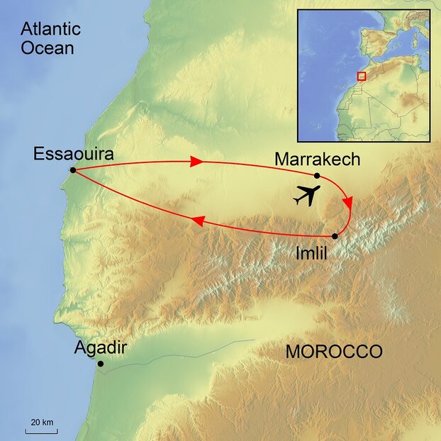 Travel between Marrakech Airport and our hotel in Marrakech takes approximately 30 minutes, transfers are by road. During the holiday we will travel by private coach / minibus.