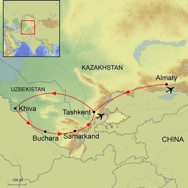 Pass through Kazakhstan’s national parks for spectacular views of its beautiful wilderness before discovering mediaeval Islamic culture in Uzbekistan.