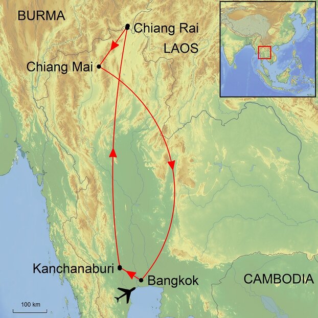 Enjoy breakfast at the hotel and some free time at leisure before checking out. A private transfer will take you from Kanchanaburi to Bangkok Airport for your flight to Chiang Rai.