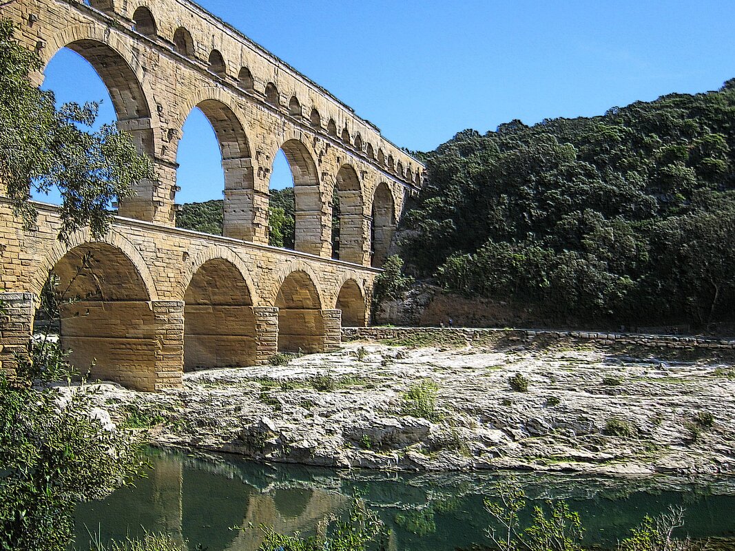 During your visit, we'll take a walk to Pont du Gard, a marvel crafted by the Romans two thousand years ago. They ingeniously constructed a 50 km long aqueduct to transport spring water from near Uzès to Nîmes. This remarkable aqueduct spans the deep River Gard with an awe-inspiring 160 ft high stone structure, now renowned as the Pont du Gard.
