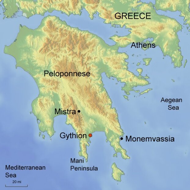 Refreshments follow at a nearby taverna followed by a visit to the unspoilt Archaeological site of Ancient Sparti (1 hour), before returning to Gythio.
