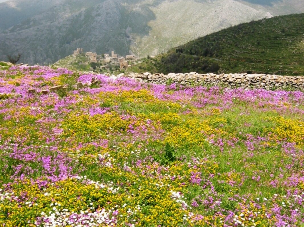 Experience the gentle caress of a spring breeze and the soothing embrace of the sun as you explore the untamed beauty of the Mani Peninsula, enveloped by a vibrant tapestry of blooming flowers.