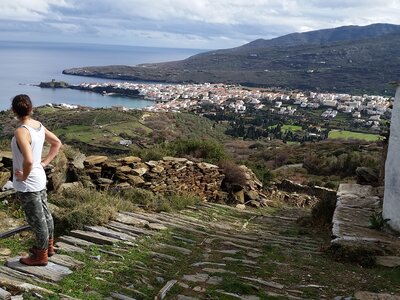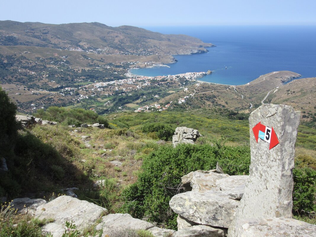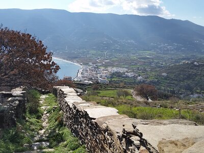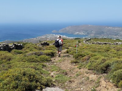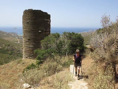 On the final day of your Andros journey, you'll embark on a walk in the hinterland of Gavrio. The route takes you beneath the charmingly situated village of Ano Gavrio, leading to an ascent via a pleasant yet steep path to the summit of a hill, offering breathtaking views. Subsequently, you'll descend into the valley of Agios Petros, passing by the impressive Hellenistic Tower on your way back to the beach. If your accommodations are in Gavrio, the return leg involves a coastal walk to your hotel in Gavrio.
