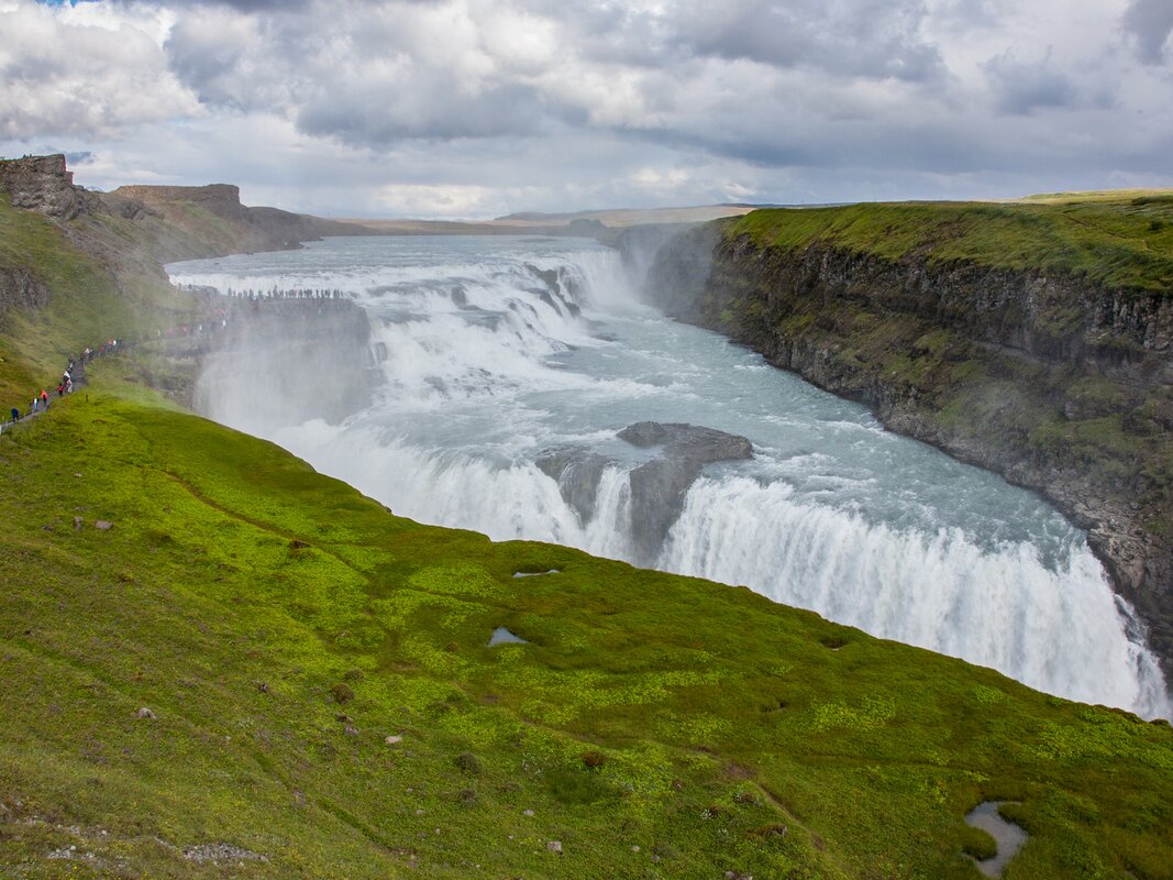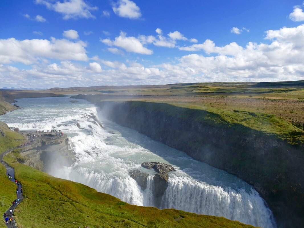Gulfoss waterfall, also known as the golden falls, is surrounded by a dramatic 70m canyon where water free falls over 10m from the first waterfall and over 21m from the second. The incredible noise of the water thundering and crashing over the falls is immense and the sheer size of Gulfoss is extraordinary.