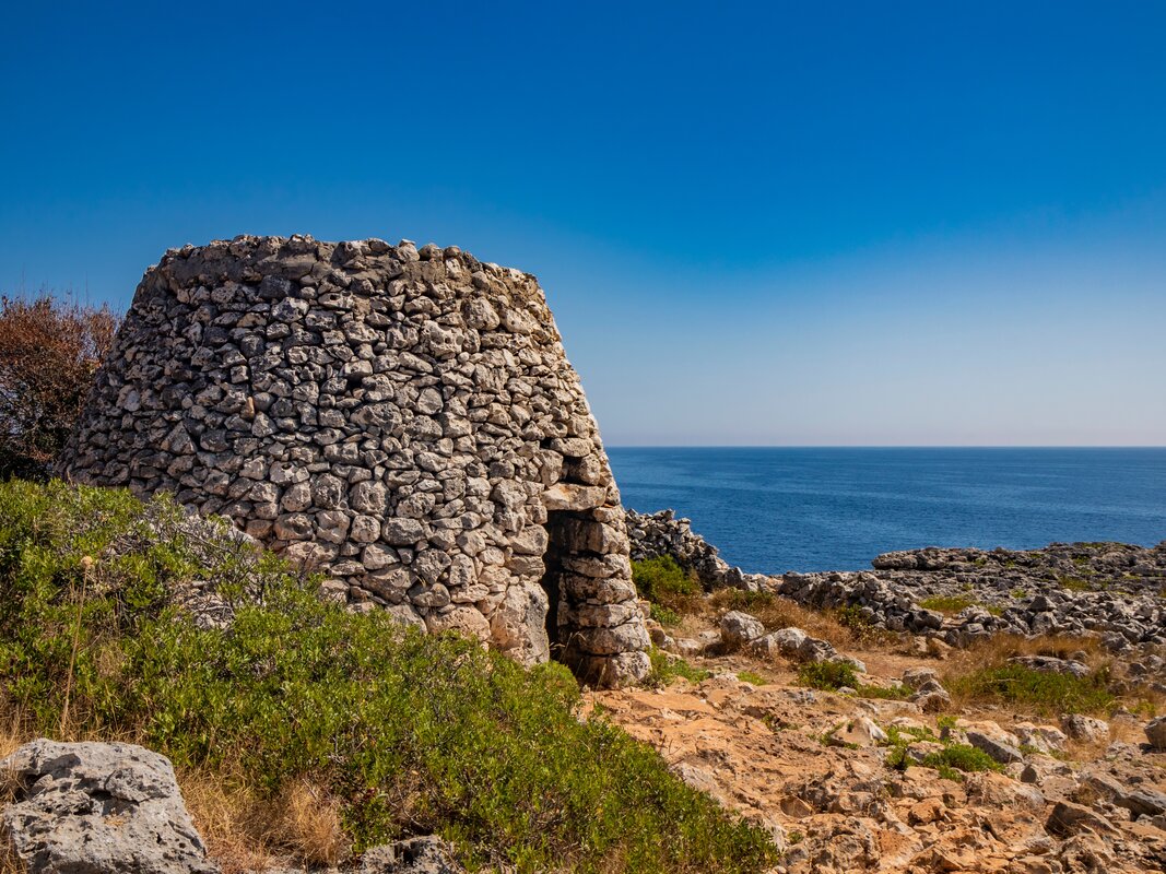 The first stop on today's walk coincides with the beautiful inlet at Porto Badisco, just opposite the local bar where they make great coffee and sandwiches to go. Stepping out along a shepherds’ trail, you hug the coast and pass typical stone ‘pagliari’, round, flat-topped shepherds’ huts. Six kilometres into the walk, your route moves inland and climbs up toward a plateau where you traipse through high fields on footpaths. Plan to pause for a picnic at a pretty pine grove for some welcome shade on sunny days. A surfaced road leads downhill, as you hike the last section into the exotic spa town of Santa Cesarea Terme with yet a few more fab swimming spots.