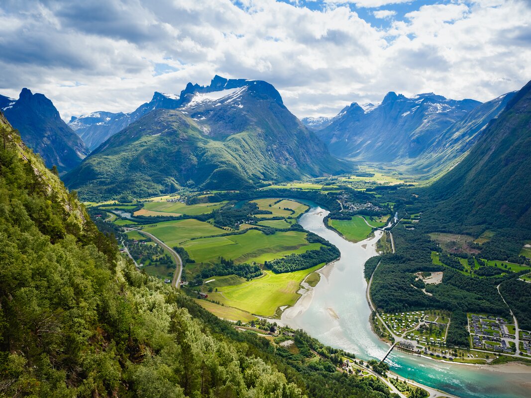 Drive from Åndalsnes to the spectacular "Trollstigen" road with its 11 hairpin bends. The journey takes you to the viewpoint point on the Trollstigen Plateau suspended above the valley, framed by glass railings with a panoramic view of the surrounding dramatic mountains. Take a walk to the unique emerald green and turquoise blue Bispevannet. This distinctive glacial colour makes for a perfect picture. Surrounded by the wild Romsdalsfjella and the view towards the Romsdalsfjord, this trail has continuous spectacular scenery.