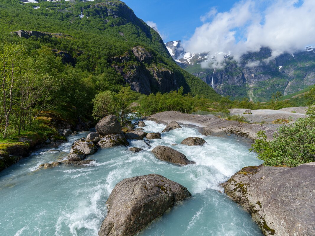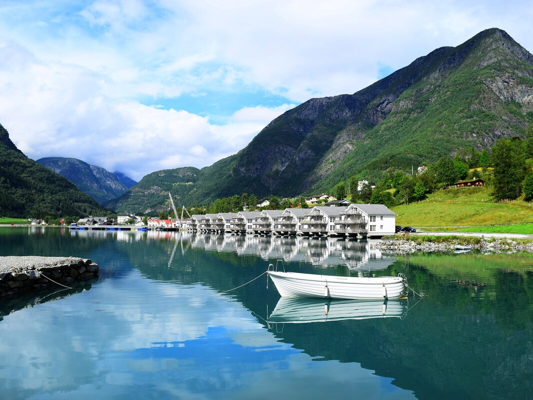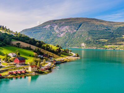 Having cruised most of the way along the dramatic Naeroyfjord and Gudvangen, we reach the small alpine village of Olden, encircled by towering mountains and deep fjords.
