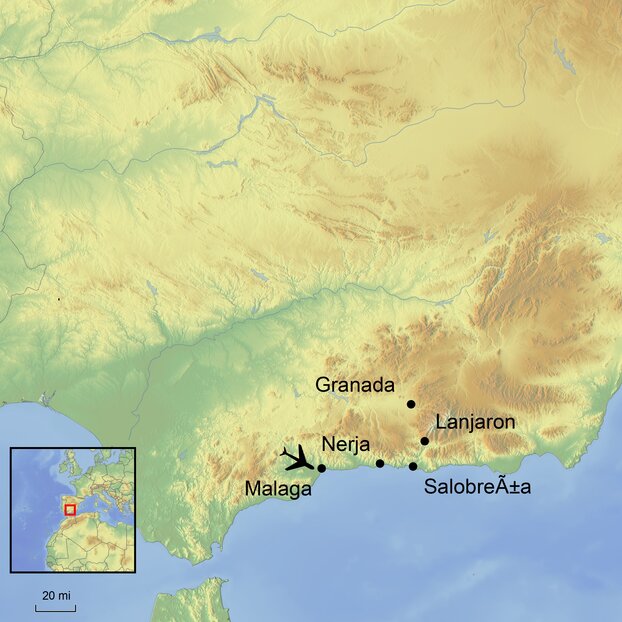 The nearest airports are Granada (45 mins) or Malaga (1 hour).