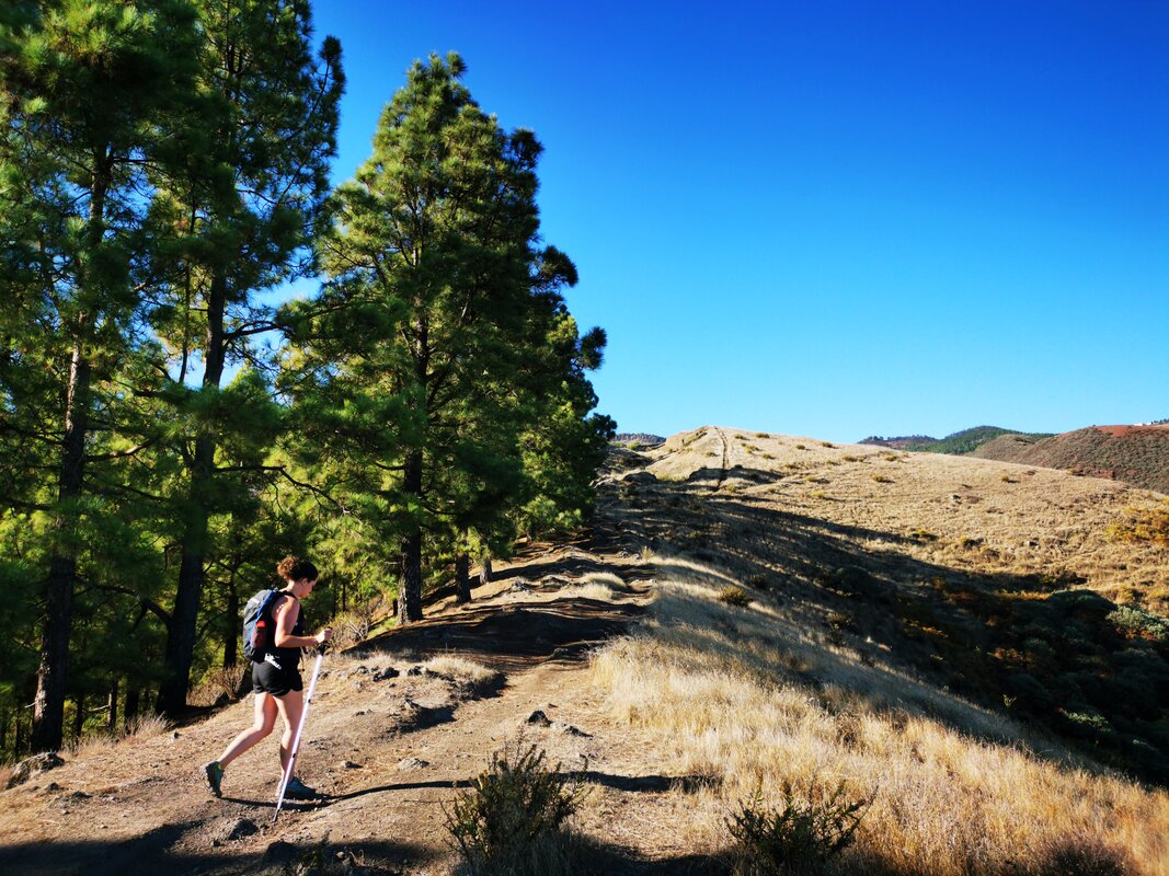 The descent from Roque Nublo takes a different path, winding through a serene evergreen forest until you reach the road, where you can catch a bus back to Tejeda. If you miss the bus or feel like walking a bit more, you can take the historic “camino real” back to the village. This adds an additional 7.25 km, with a 75 m ascent and a 450 m descent, requiring about 2 more hours of walking, some of which is on pavement.