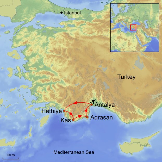 Your journey unfolds from four strategically chosen centres - Antalya, Fethiye, Kas and Adrasan, choosing the very best sections of the walk over its entire length from Ölüdeniz to Antalya. Sometimes you'll find the trail takes you off the beaten track walk off the trail if the scenery merits it. Private coach transportation has been arranged, ensuring seamless transfers to the start and end of each walk. Accompanied by a knowledgeable local guide, delve into the fascinating details about the flora, fauna, archaeology and history.