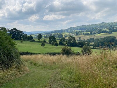 A full day walk on the Cotswold Way from the hotel today, exploring the wooded heights of Cooper's Hill - famous for its annual cheese rolling contest, continuing along the escarpment to Witcombe Wood and the village of Birdlip. A short climb in the late morning brings us to the historic Barrow from where the views extend across the Vale of Severn to the Malverns, over to Gloucester Cathedral and to the Forest of Dean. We then return to the hotel through farmland and through the sleepy village of Little Witcombe.