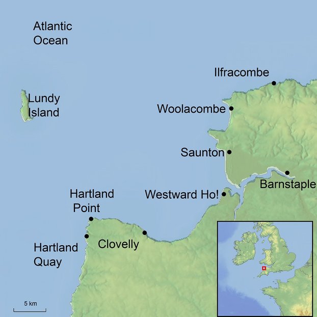 A small pebble beach with interesting rock formations located on the Atlantic coast of Devon.