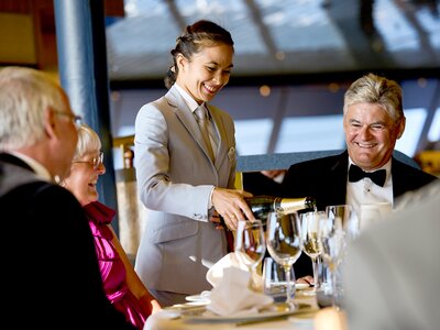 Come evening, prepare for a sumptuous five-course á la carte menu in a stylish restaurant. The menu, crafted by award-winning chefs, boasts a variety of mouth-watering options, with accommodation for special diets like fat-free, vegetarian, and gluten-free meals. Served by courteous waiting staff, the dinner experience creates a wonderful atmosphere. Our reservation for dinner at 6pm ensures you have ample time to enjoy the evening entertainment if desired. Wine options can be pre-ordered through the Maître'd, the interactive intranet in your cabin or directly at the table.