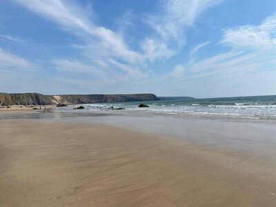 At Pwllstrodur, cross a stream then head steeply uphill round the headland and past the Iron Age promontory fort of Castell-Coch. The scenic Aber Mawr beach is an Ice Age site with the remains of a submerged coastal forest that can sometimes be seen beneath the sand at low tides. Inland there is an unspoilt reed valley with woods beyond, which makes a pleasant change and affords an excellent windbreak for a picnic lunch.