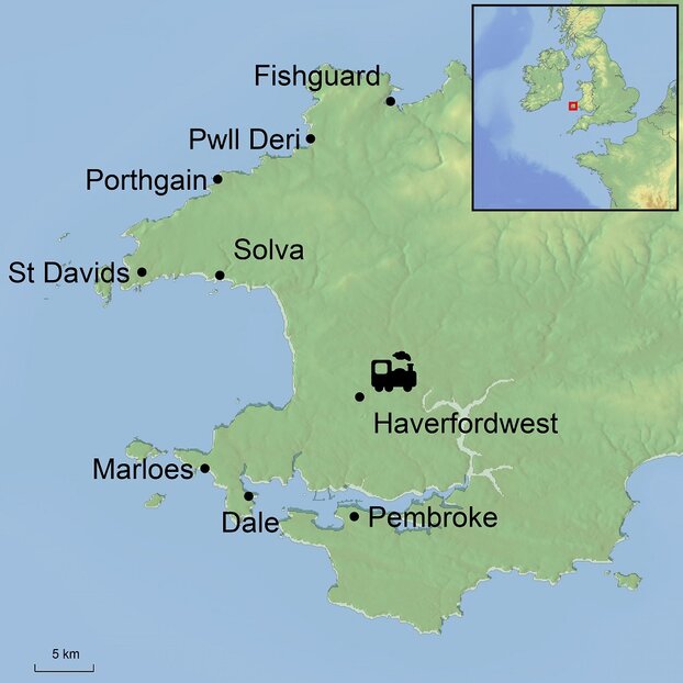 Golden sands for lunch are backed by a surreal lunar landscape of towering rock pinnacles, dark sea caves and fractured stacks, ‘Raggle Rocks’. Great name! The next headland is fantastic, with views of Grassholm and Skokholm islands and the Marine Nature Reserve below us. An en-route visit to Martins Haven RSPB Lockley lodge visitor centre with an option to continue further to before heading to Marloes village.